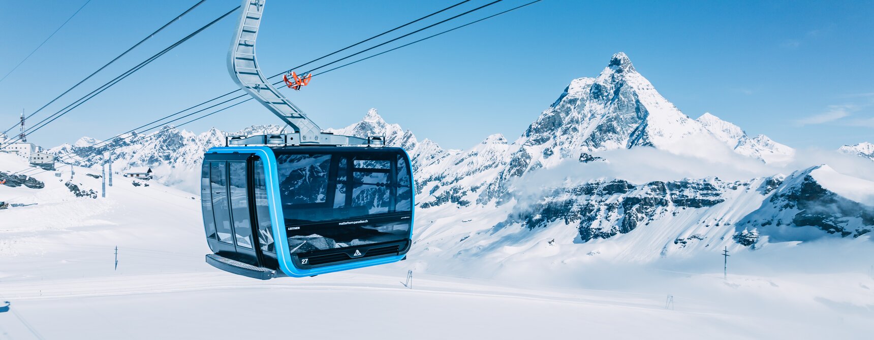 Der Dreh- und Angelpunkt, an dem Welten miteinander verschmelzen - Trockener Steg, 2‘939 m ü. M. Hier liegt die Grenze zwischen schneebedeckten Landschaften und schroffen Felswänden. Der Ausblick auf das Mattertal über die Bergketten bis hinauf auf das Matterhorn ist atemberaubend.